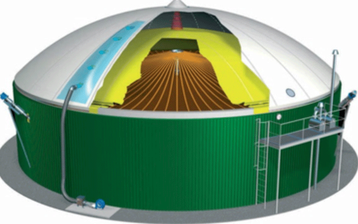 Образующийся в ферментере и, в небольшом количестве еще в дображивателе биогаз, улавливается и собирается в пленочных газохранилищах над ферментером и дображивателем.