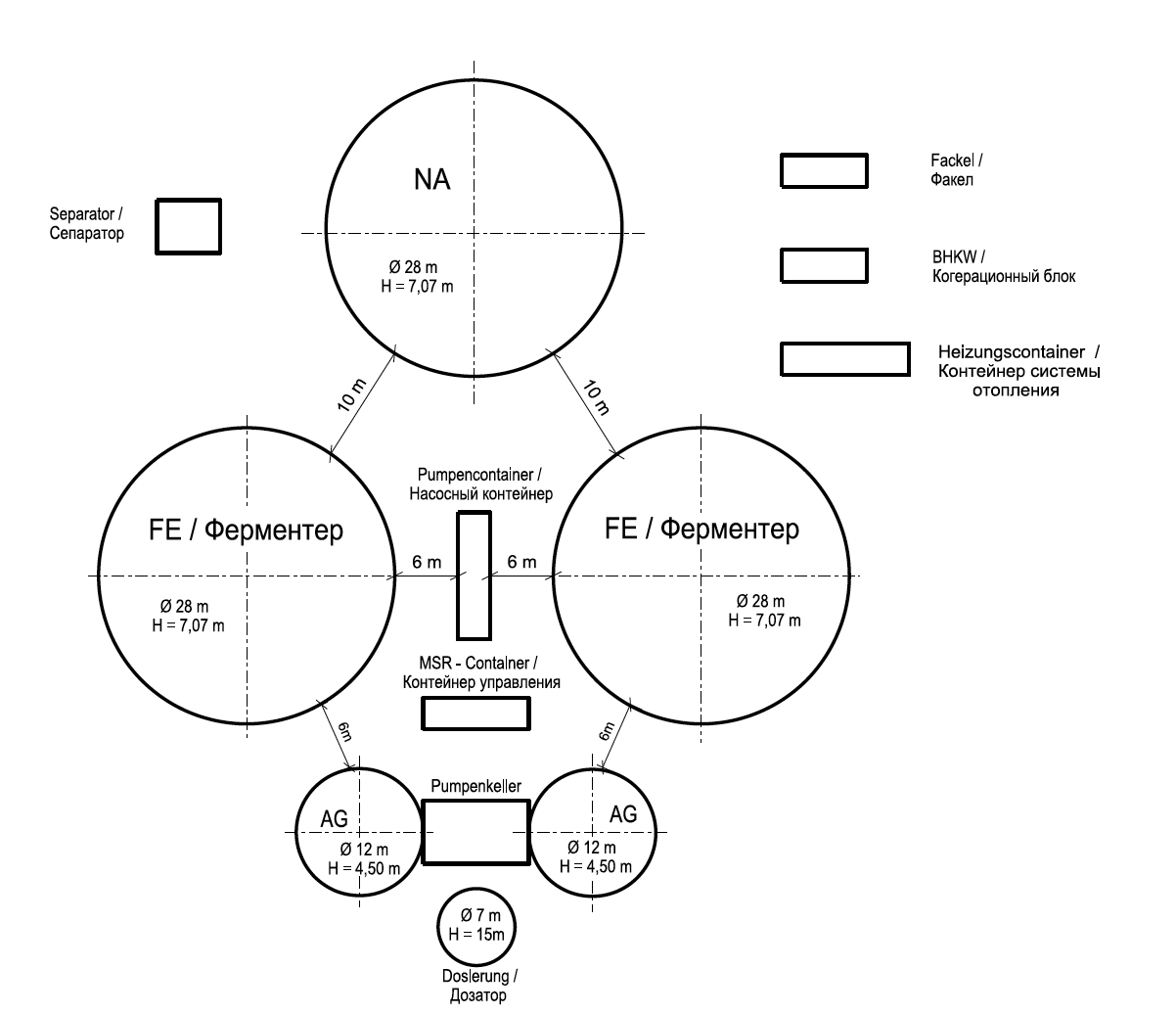 - 2 ферментера с обогревом, мешалкой и двойным (внутренним и внешним) плёночным перекрытием в качестве газового пузыря изготовлены как бетонные емкости;