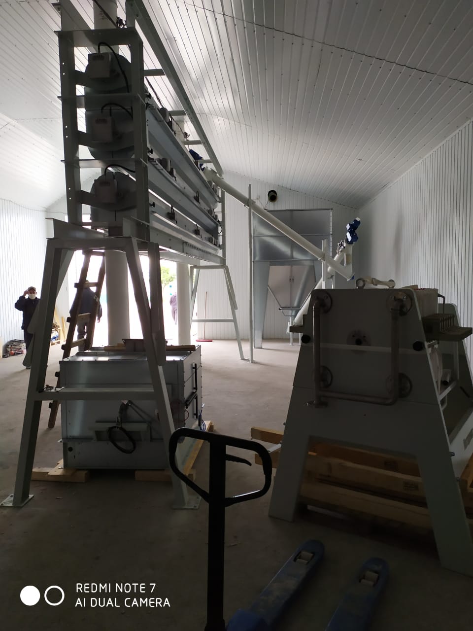 Сырьё подается из нории в накопительный бункер №1. После чего шнековым конвейером №2 сырьё проходит очистную машину №3, которая подсоединена к системе аспирации, а так же выполняет функцию калибровки семечки. Мелкие калиброванные семена сразу попадают в шнековый конвейер №17, далее на участок прессования.