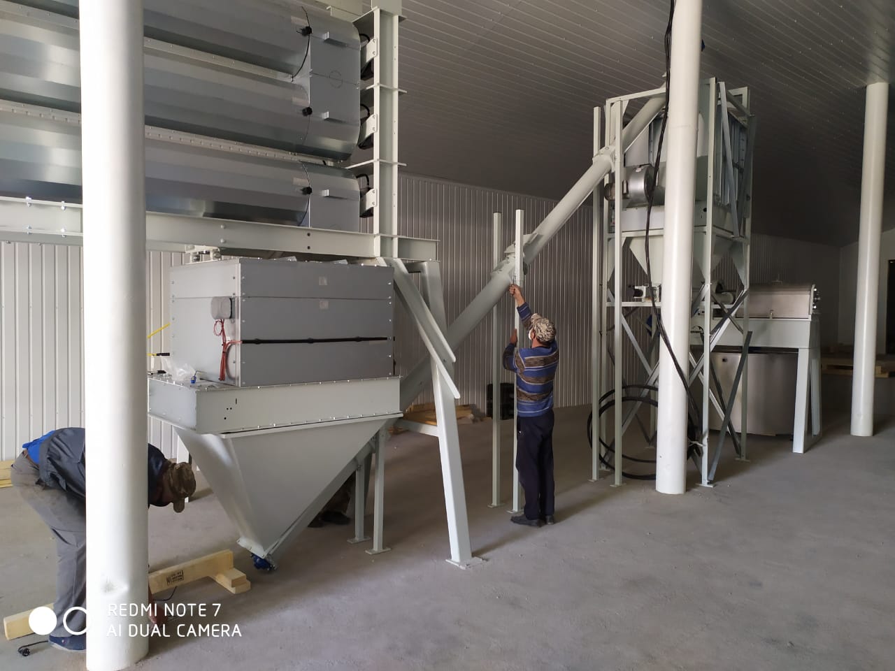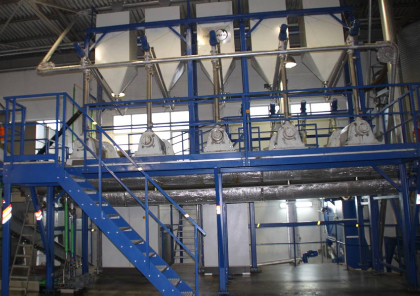 После очистной машины №3 при помощи нории №5 сырьё попадает в жаровню-кондиционер №6, где происходит нагрев продукта до оптимальной температуры перед обрушкой. Жаровня циклического типа, нагрев при помощи задуваемого нагретого воздуха (тепловая пушка №7)